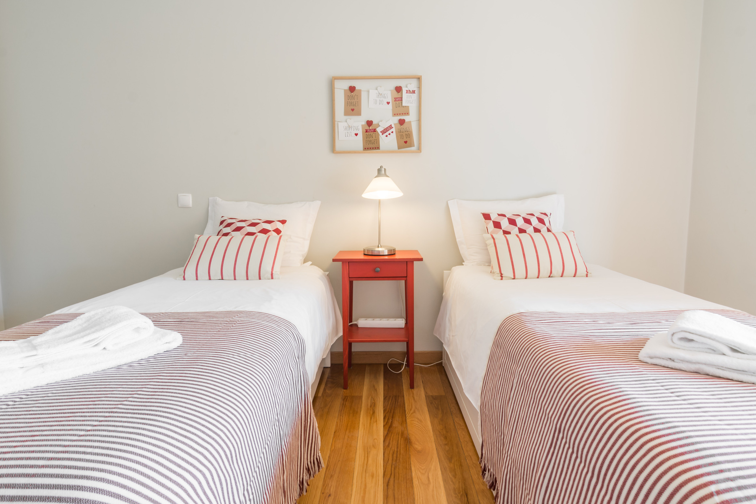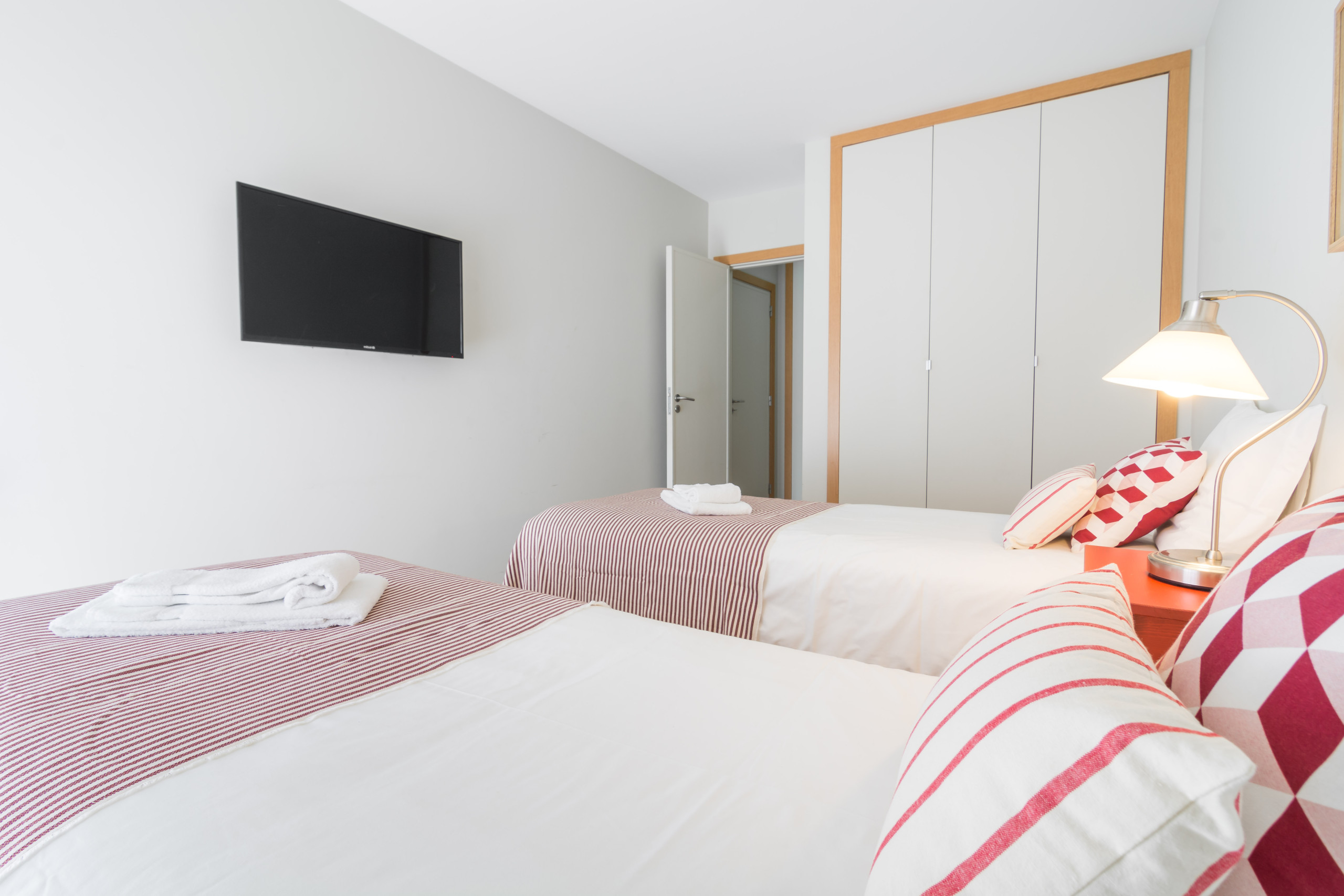 Un dormitorio tiene una cama doble y un baño con bañera y ducha. Tiene un acceso directo al balcón a través de la ventana deslizante. El otro dormitorio tiene dos camas individuales y también accede directamente al balcón. Cada habitación tiene un gran televisor de pantalla plana en la pared. Hay mucho espacio de almacenamiento en varios armarios, tanto en las habitaciones como en las áreas comunes.
