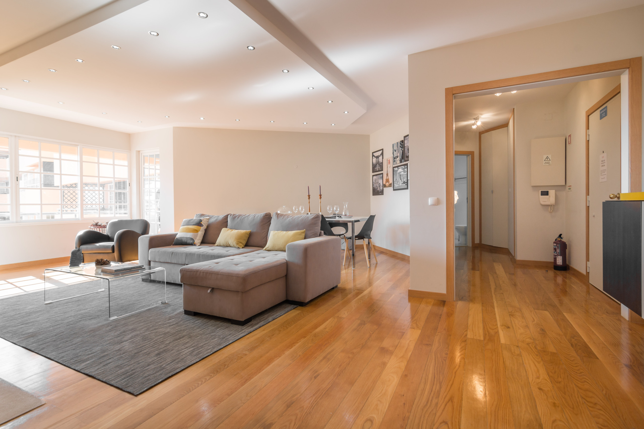 Amplio y luminoso apartamento en condominio Cascais Park en Guia, Cascais. La sala de estar es grande y luminosa. Hay una zona de estar con un cómodo sofá y un comedor con una gran mesa con sillas. Hay una gran ventana que da al lado del mar donde también se puede ver el condominio desde la cima. Cerca de esa ventana tiene una puerta que da acceso a la cocina y otra puerta que da acceso al balcón.
