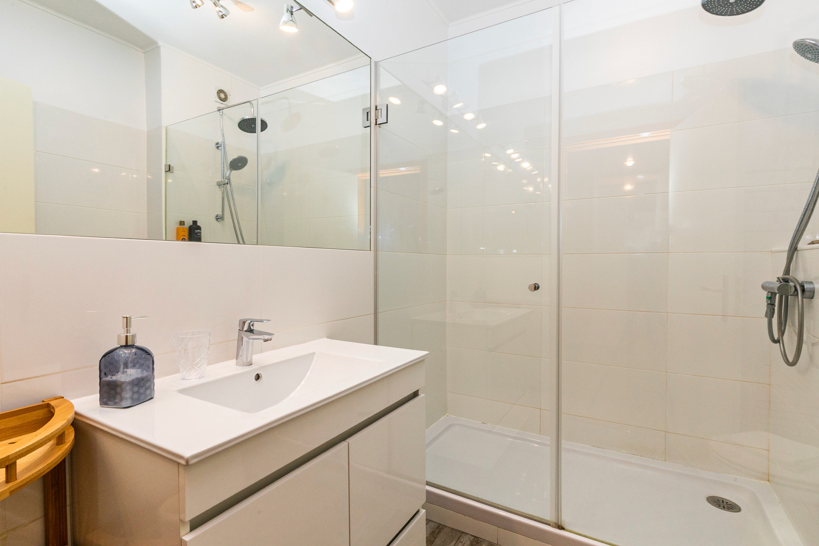 El primer dormitorio, es grande e incluye un gran armario y dos camas individuales. El segundo dormitorio, también tiene un gran armario y una división separada que se puede usar como área de trabajo. Hay dos baños, ambos con ducha. Por un lado, el más pequeño tiene una cabina de ducha y el segundo, tiene una ducha de vidrio.