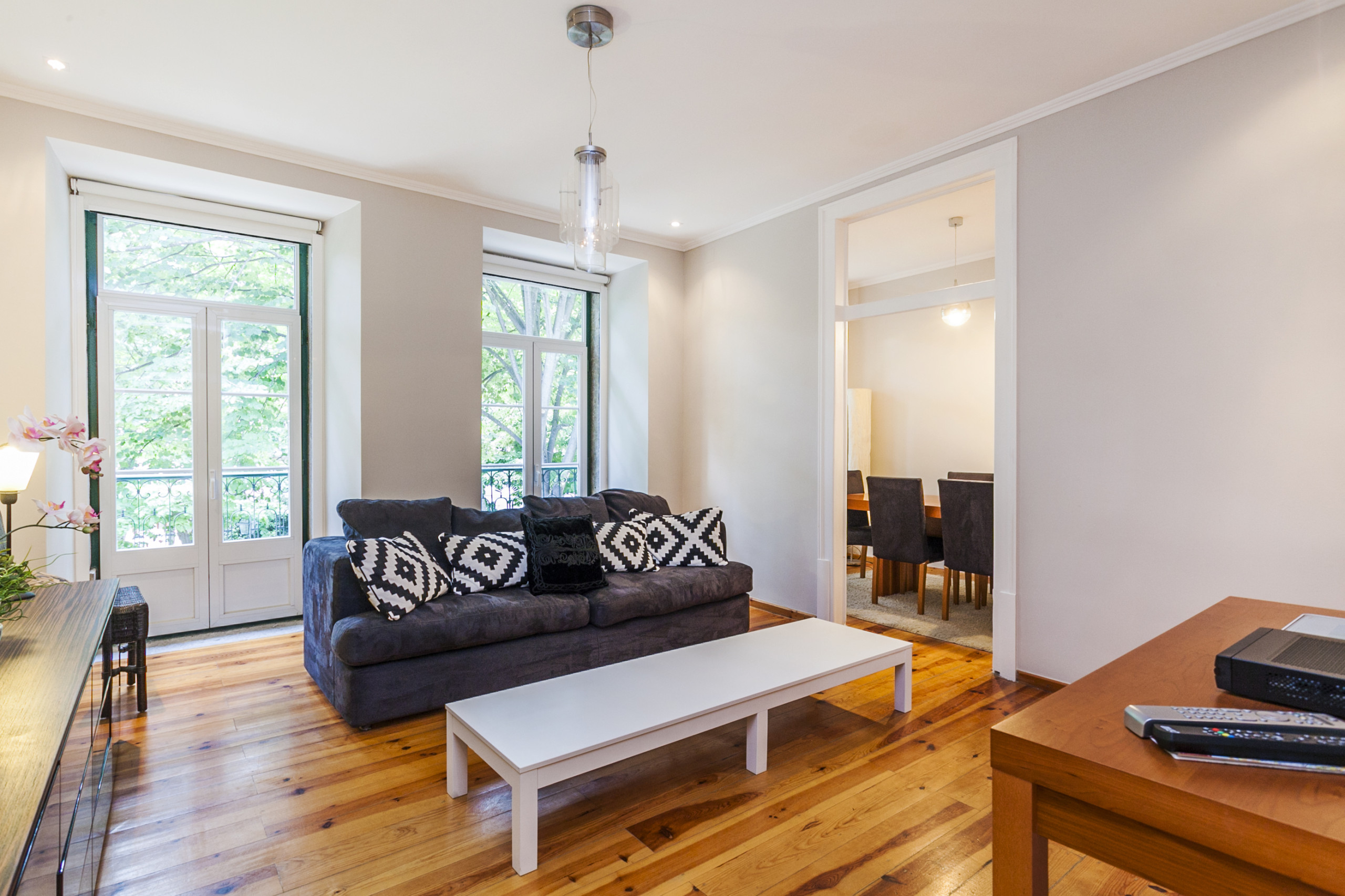Situado en el corazón de la Plaza de las Flores este bonito y espacioso apartamento tiene todo para hacer que su visita sea de Lisboa inolvidable. La entrada del apartamento es de Praça das Flores y ofrece una vista nive sobre esa plaza desde la sala de estar y comedor. El apartamento cuenta con una gran sala de estar, donde podrá relajarse y ver la televisión que conects con el comedor con una gran mesa y 6 sillas.