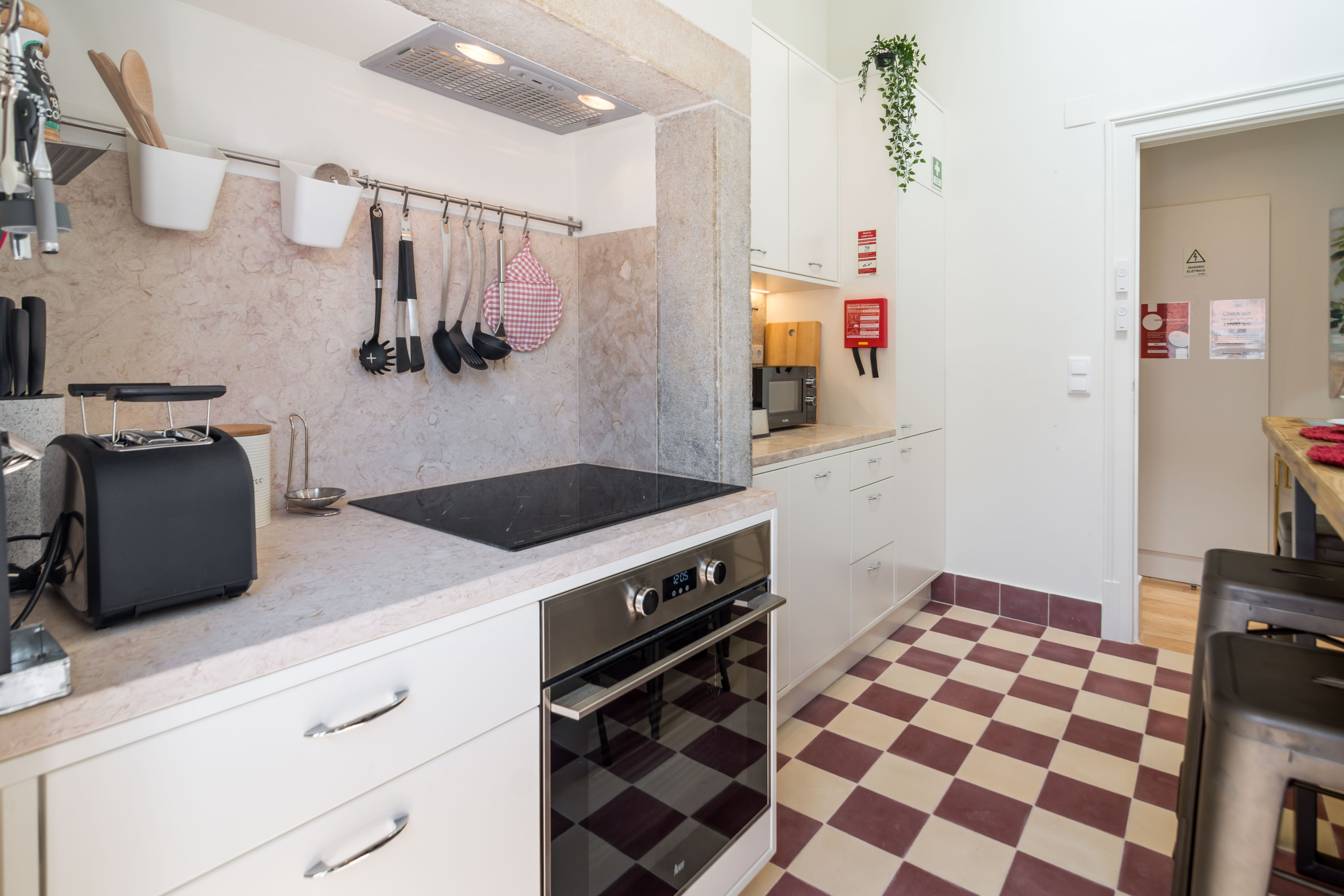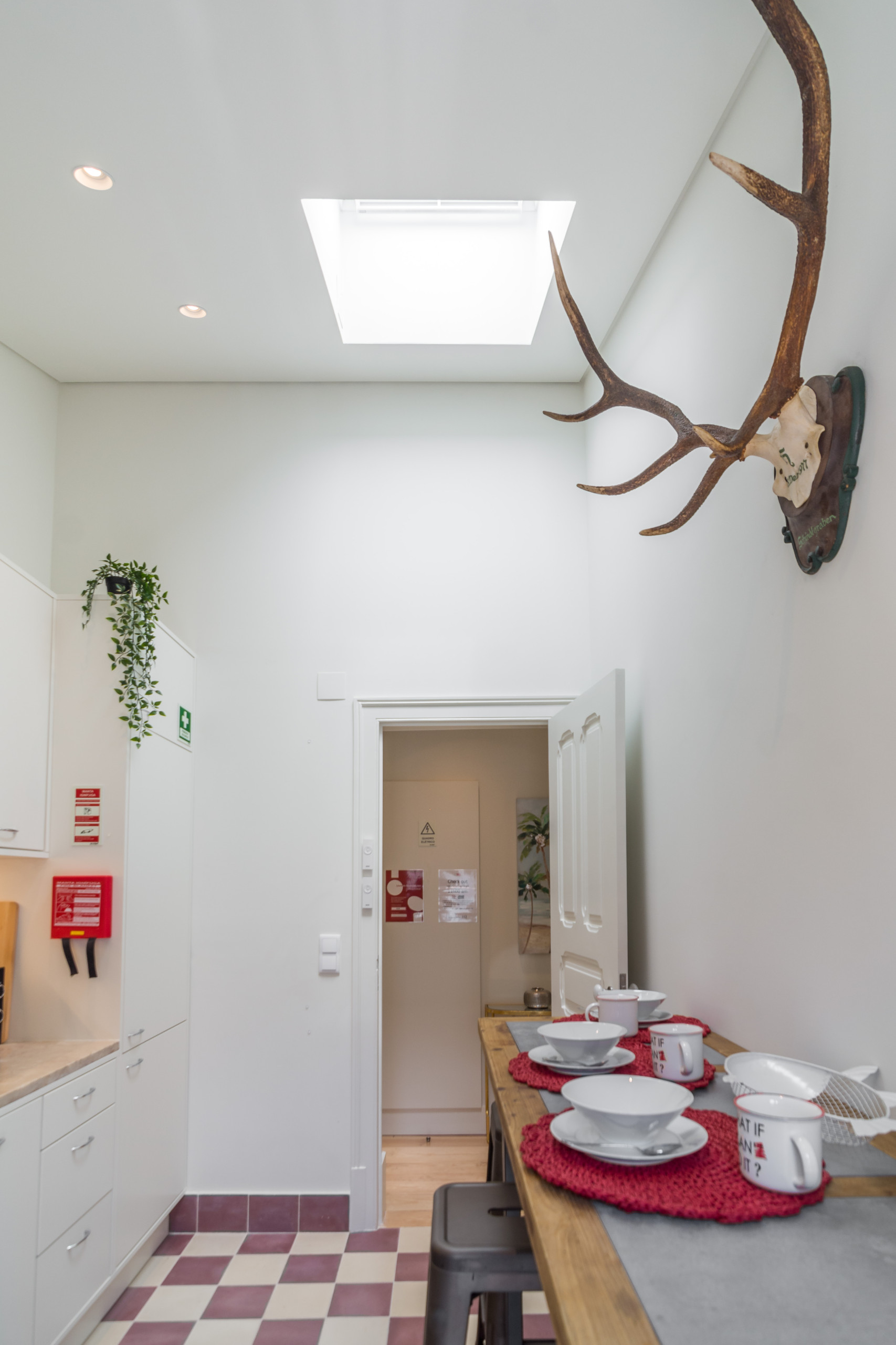 O apartamento em si é muito brilhante como é o último andar e tem duas janelas do telhado e muitas janelas. Fica num segundo andar sem acesso por elevador. A decoração é elegante e com muitos detalhes. Ao entrar no apartamento, você tem à sua direita a moderna cozinha, com uma janela no teto e uma elegante mesa com 4 lugares. Tem todos os utensílios e utensílios de cozinha necessários para preparar qualquer tipo de refeição. A placa vitrocerâmica é de indução e você tem uma máquina de lavar louça disponível, bem como uma máquina de café Nespresso. Há uma porta francesa que dá acesso à varanda, também acessível a partir da sala de estar. Na varanda você tem uma porta de madeira que dá acesso a uma máquina de lavar e secar. Na varanda você tem uma mesa e duas cadeiras, bem como um jardim vertical.