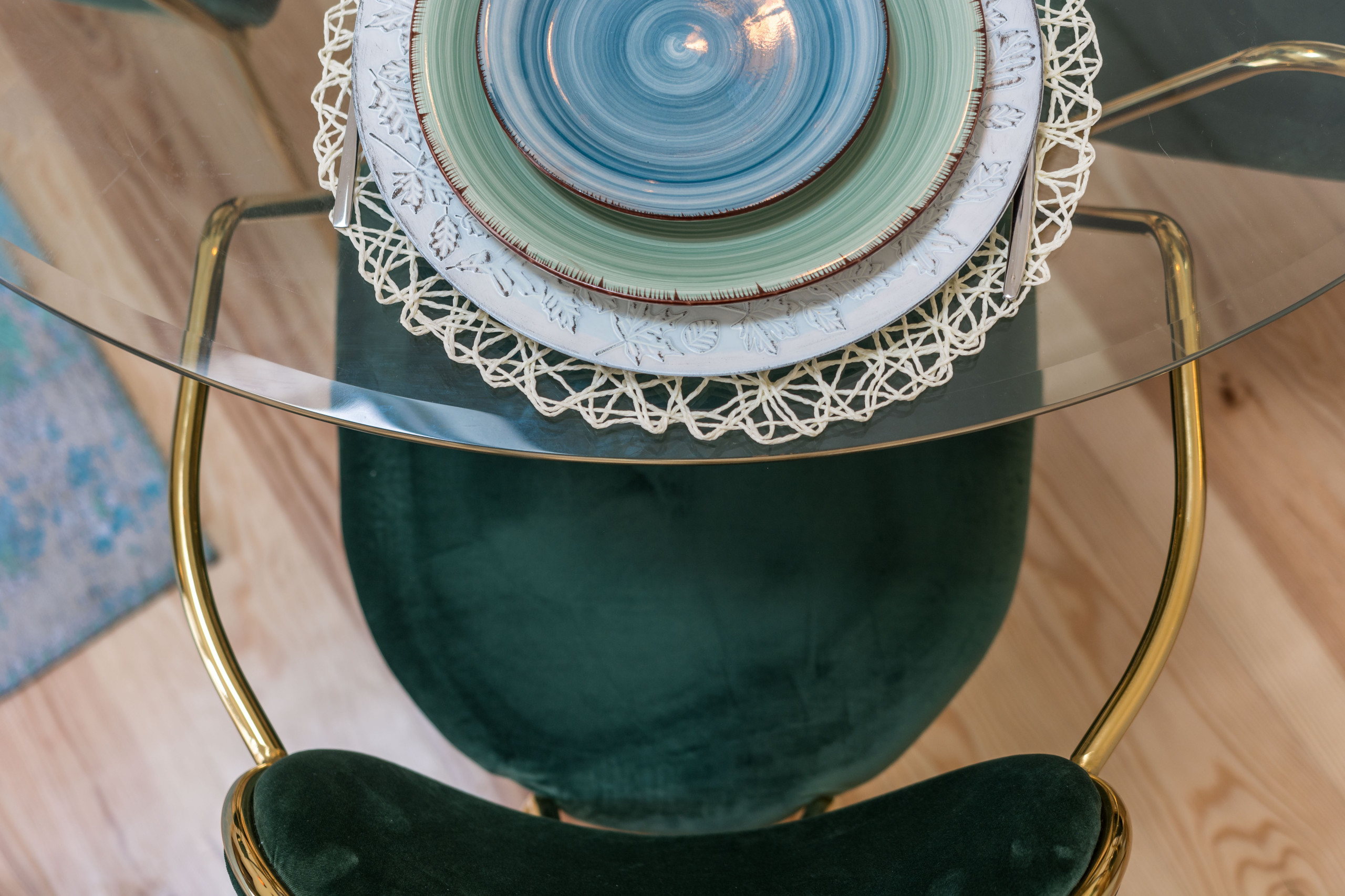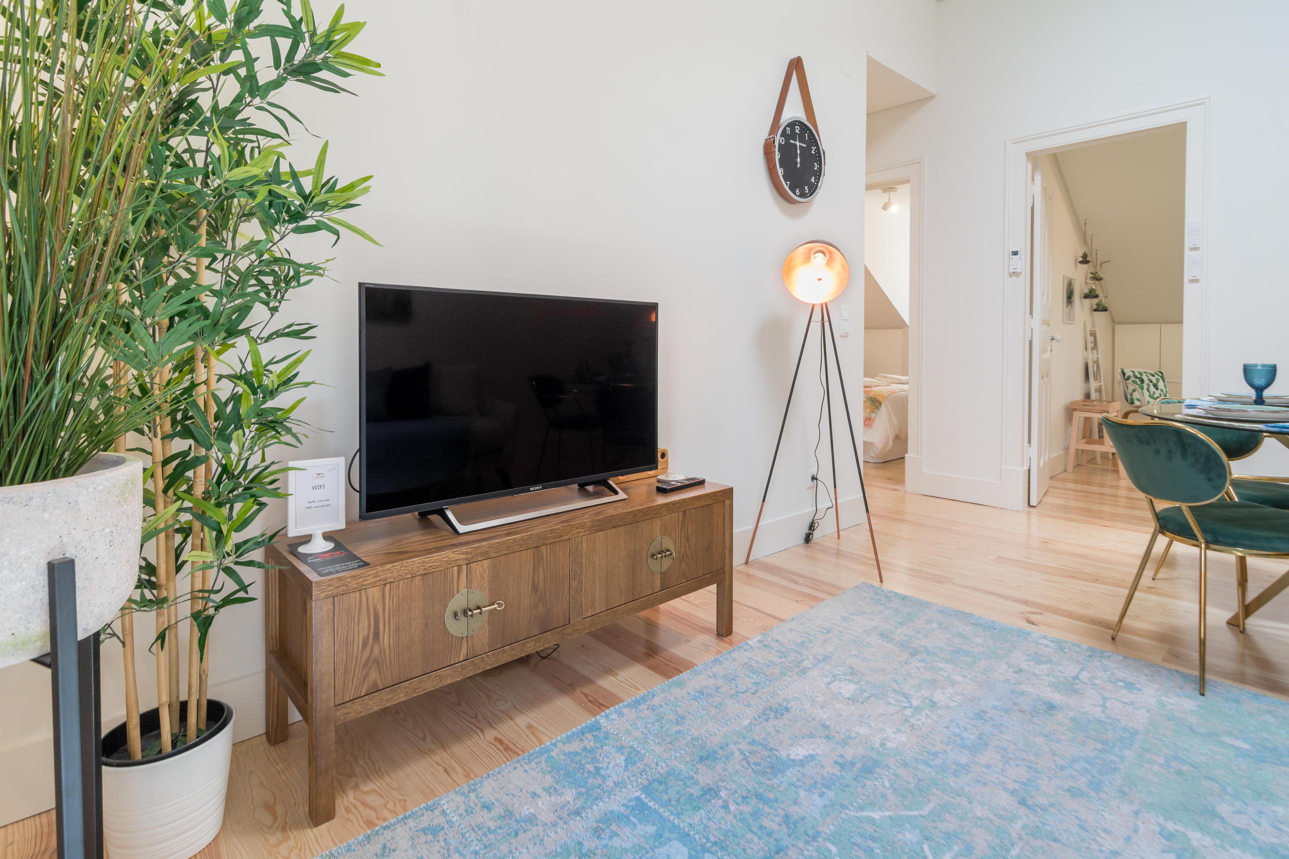 No final você tem a sala de jantar e estar com teto alto e uma janela do telhado. Há uma grande TV de tela plana e uma coluna de som bluetooth. Há uma mesa de vidro e 4 cadeiras modernas. A decoração é incrível e você vai sentir um ambiente muito acolhedor.