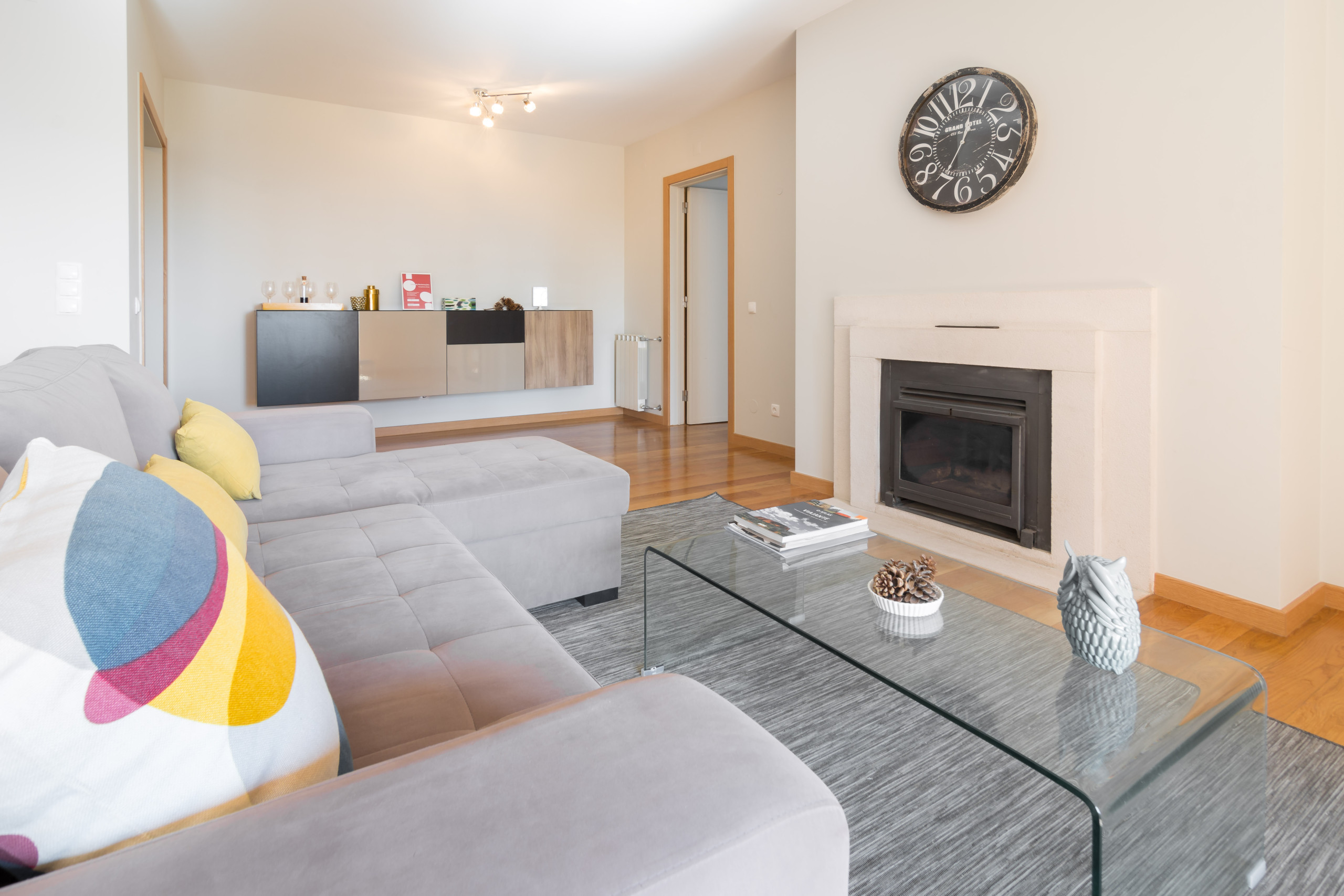 Spacious and bright apartment in condominium Cascais Park in Guia, Cascais. The living room is large and bright. There is a seating area with a comfortable sofa and a dining area with a big table with chairs. There is a big window facing the sea side where you can also see the condominium pool from the top. Close to that window you have one door that gives access to the kitchen and another door giving access to the balcony.