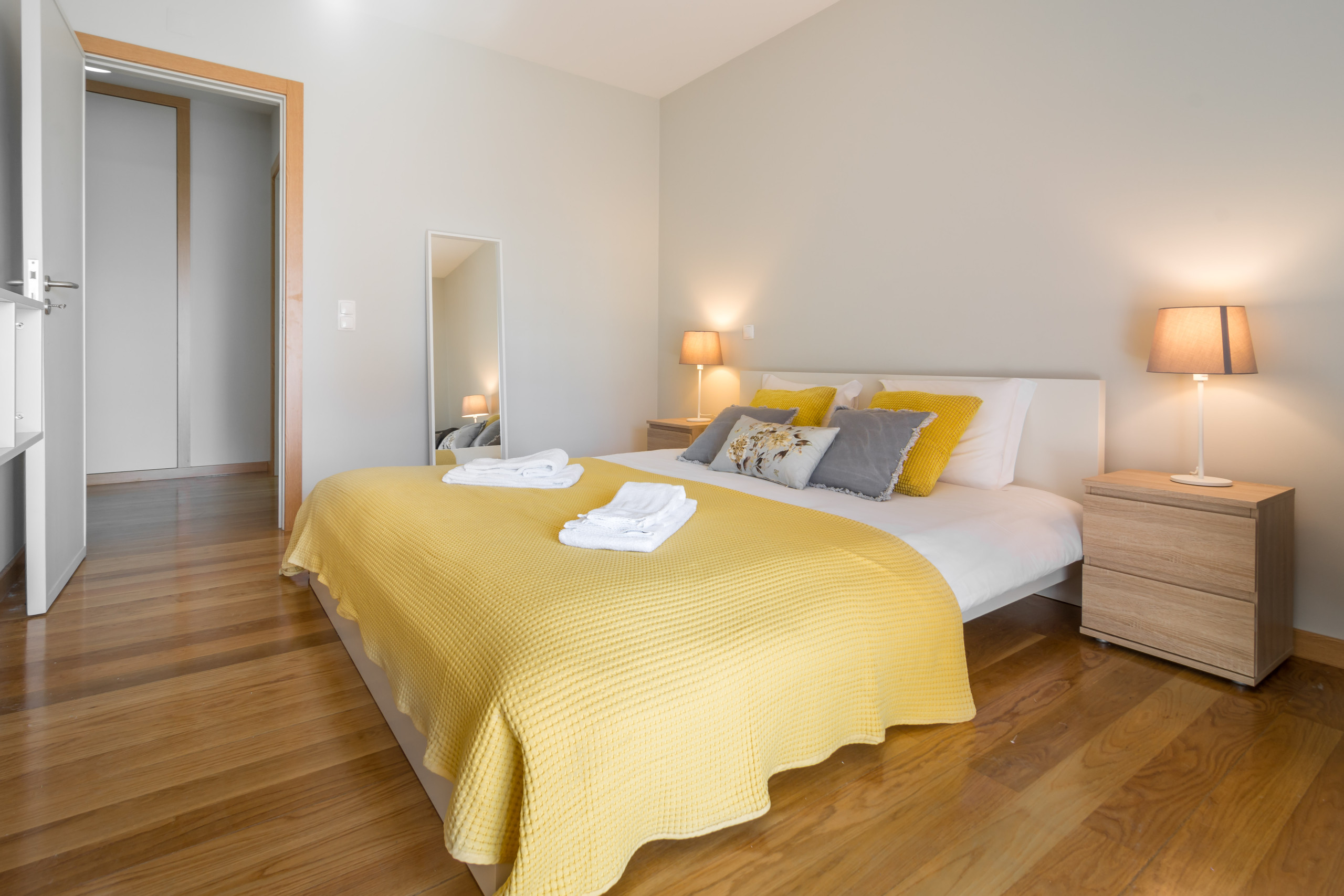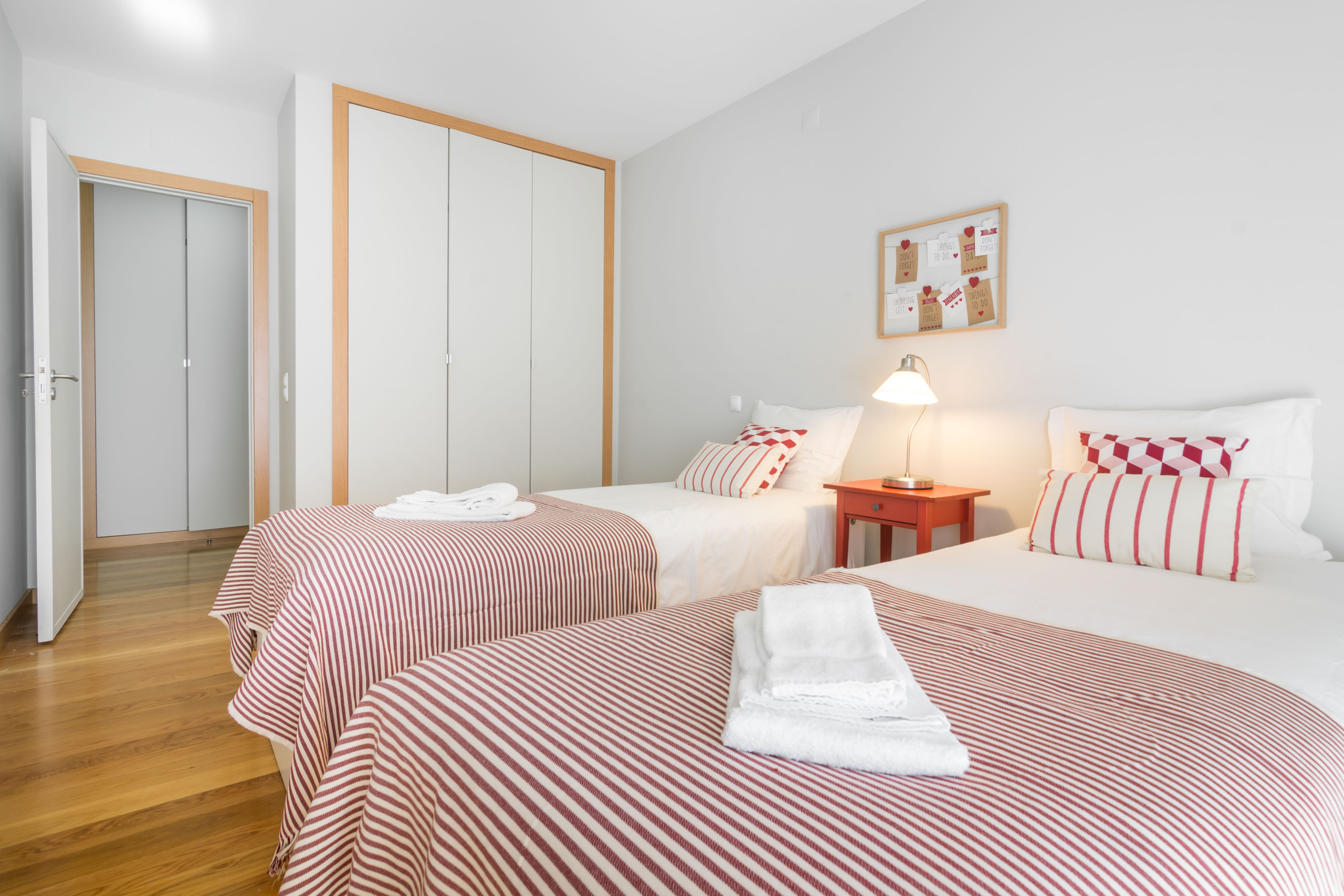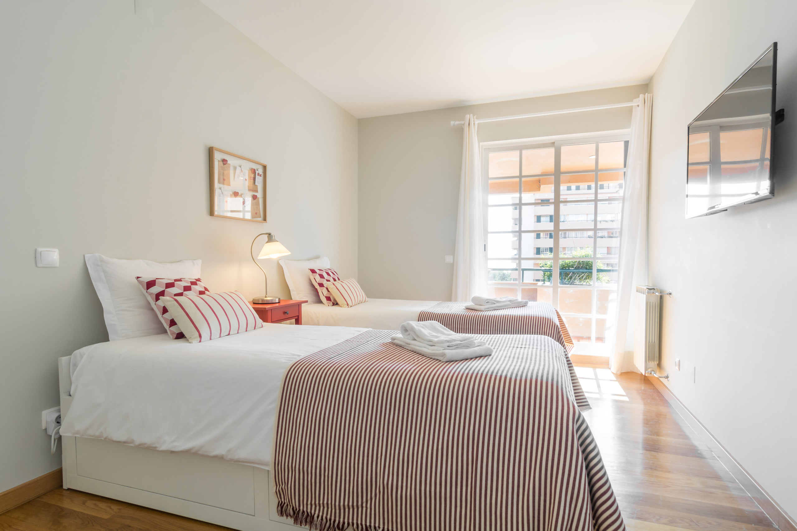 One bedroom has a double bed and an ensuite bathroom featuring a bath with shower. It has a direct access to the balcony through the slidding window. The other bedroom has two single beds and also accesses directly the balcony. Each bedroom has a big flatscreen TV on the wall. There are plenty of storage space in several closets, both in the bedrooms and common areas.