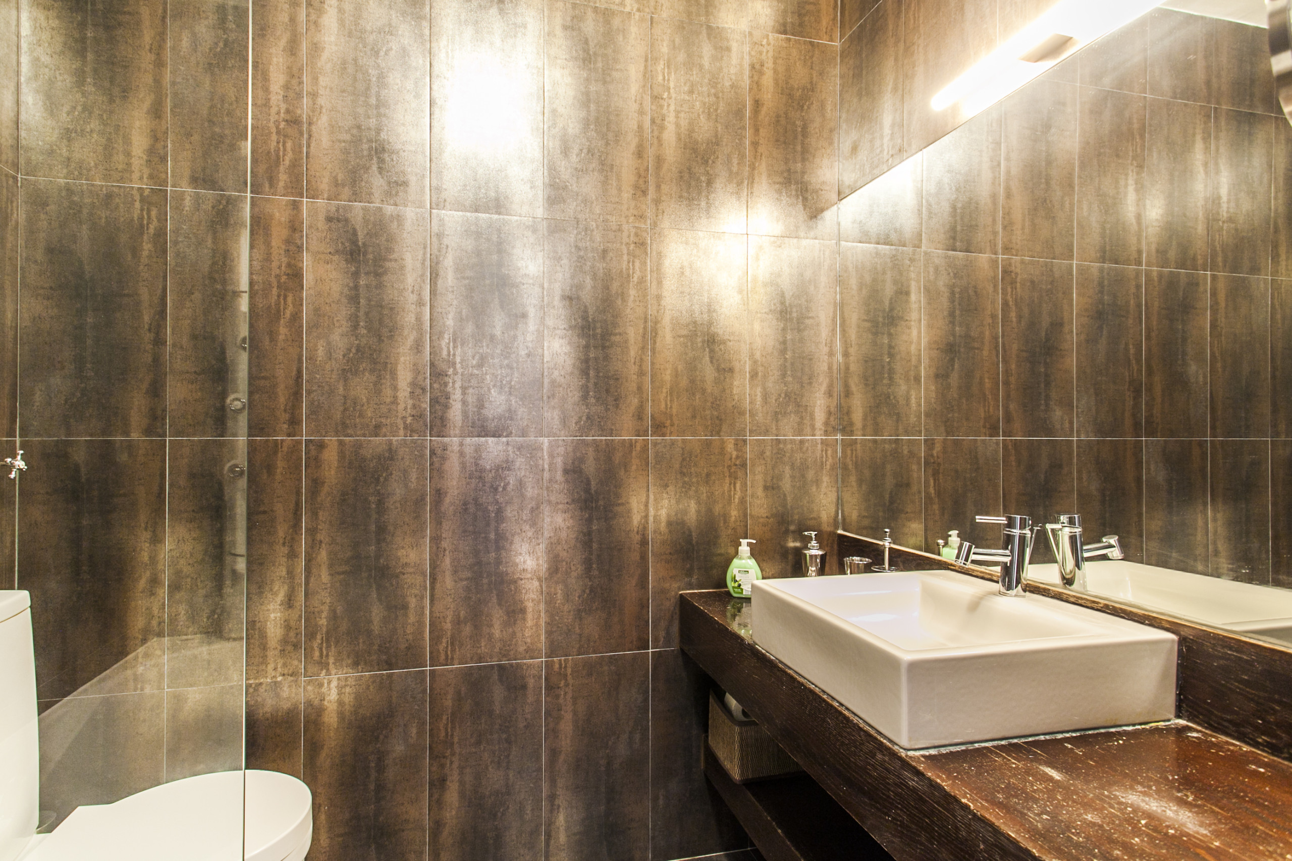 The bathroom is modern, stylish and features a bath tub with an advanced shower.